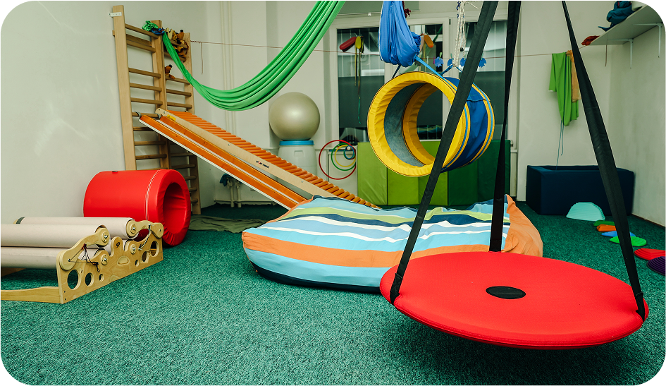 A foglalkozások 120 m²-es, multiszenzoros terápiás térben zajlanak, két nagy fejlesztőteremben. A gyermekeket legmodernebb, Németországból beszerzett eszközök várják, amelyek segítik az érzékszervi rendezést és a mozgásfejlődést. A terek kialakításánál elsődleges szempont volt, hogy biztonságos, játékos és motiváló környezetben történjen a terápia – ahol a gyermekek szívesen mozognak, próbálkoznak, és fejlődnek.